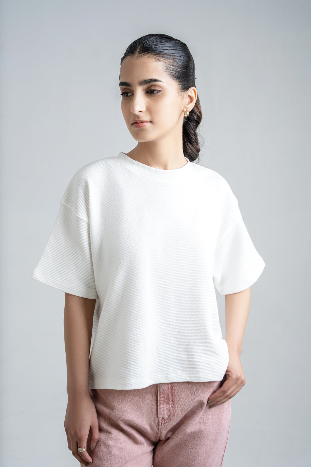 The Box Fit T-Shirt in ottoman fabric offers a relaxed, boxy silhouette with a textured, ribbed fabric for a modern, comfortable style.