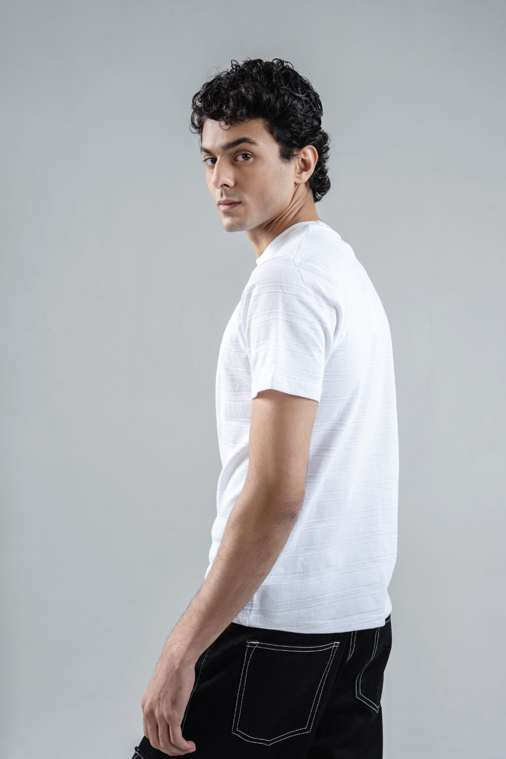 A Crew Neck Jacquard T-shirt featuring a classic crew neck design and intricate textured jacquard fabric, adding depth for a Minimalist but sophisticated look. Perfect for casual, everyday wear.