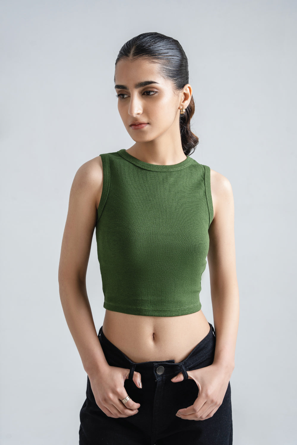 olive green cropped tank top offers a trendy, relaxed fit, perfect for casual outfits or layering.