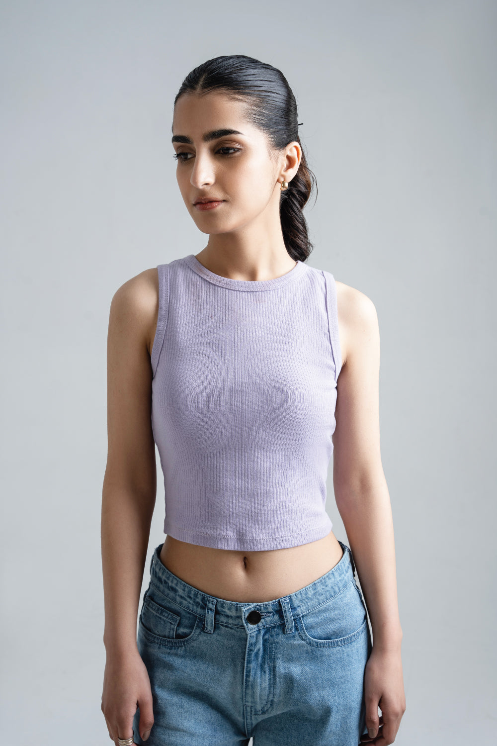 Lilac cropped tank top is a sleek, sleeveless piece that hits at the waist, blending comfort with a stylish, casual look.