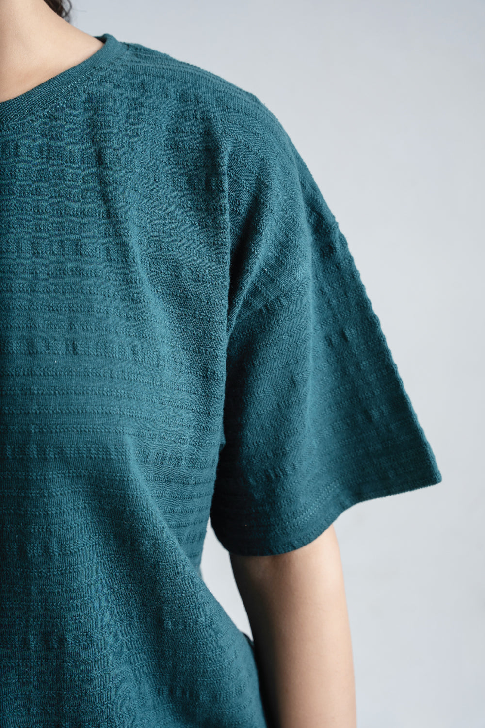 A box-fit t-shirt made from textured jacquard fabric, offering a laid-back fit and a unique, eye-catching pattern.