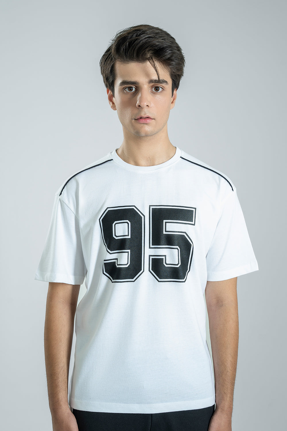 White crew-neck t-shirt with a sporty look. Features bold "95" print on the front. Black piping detail adds a modern touch.